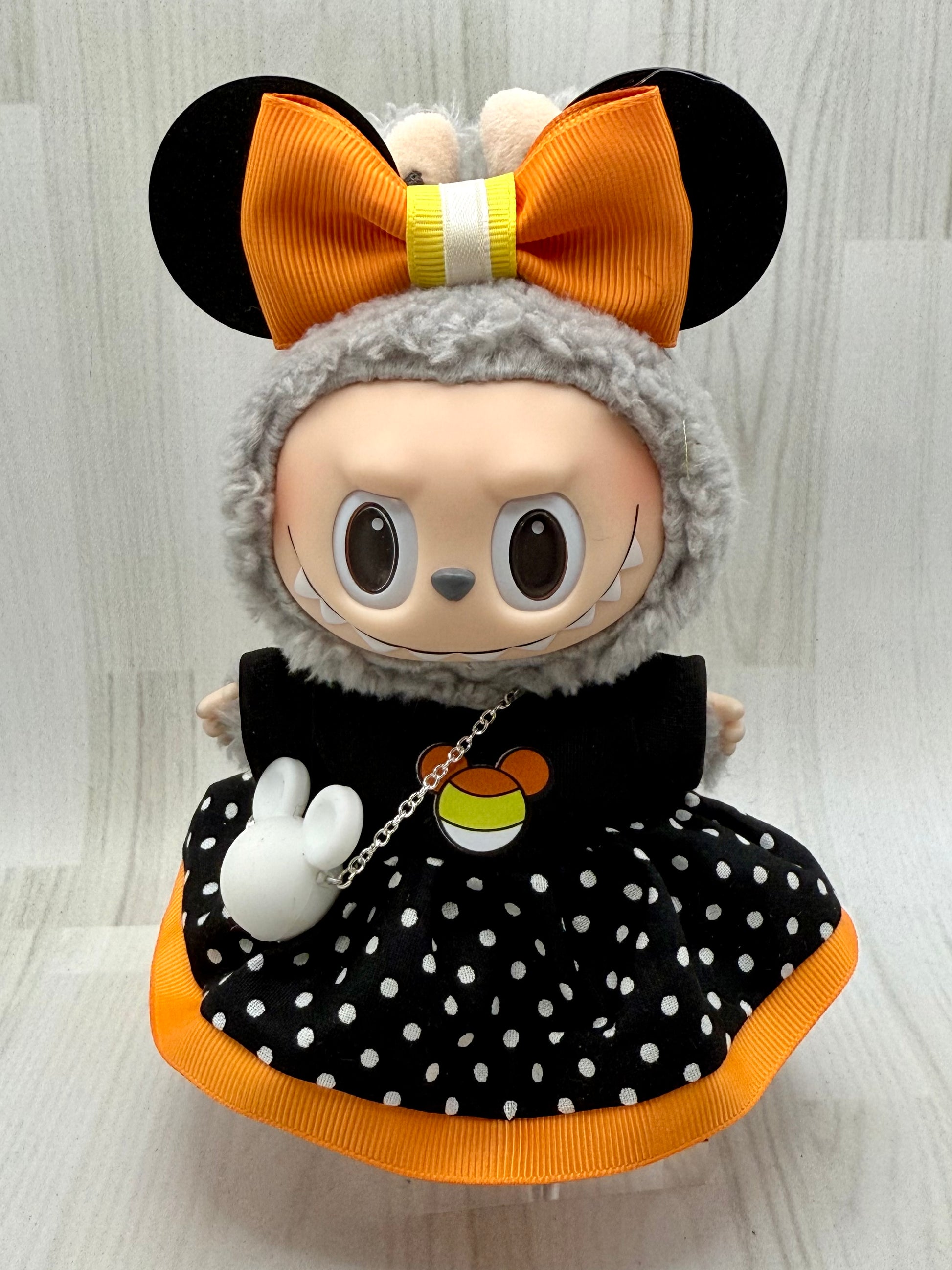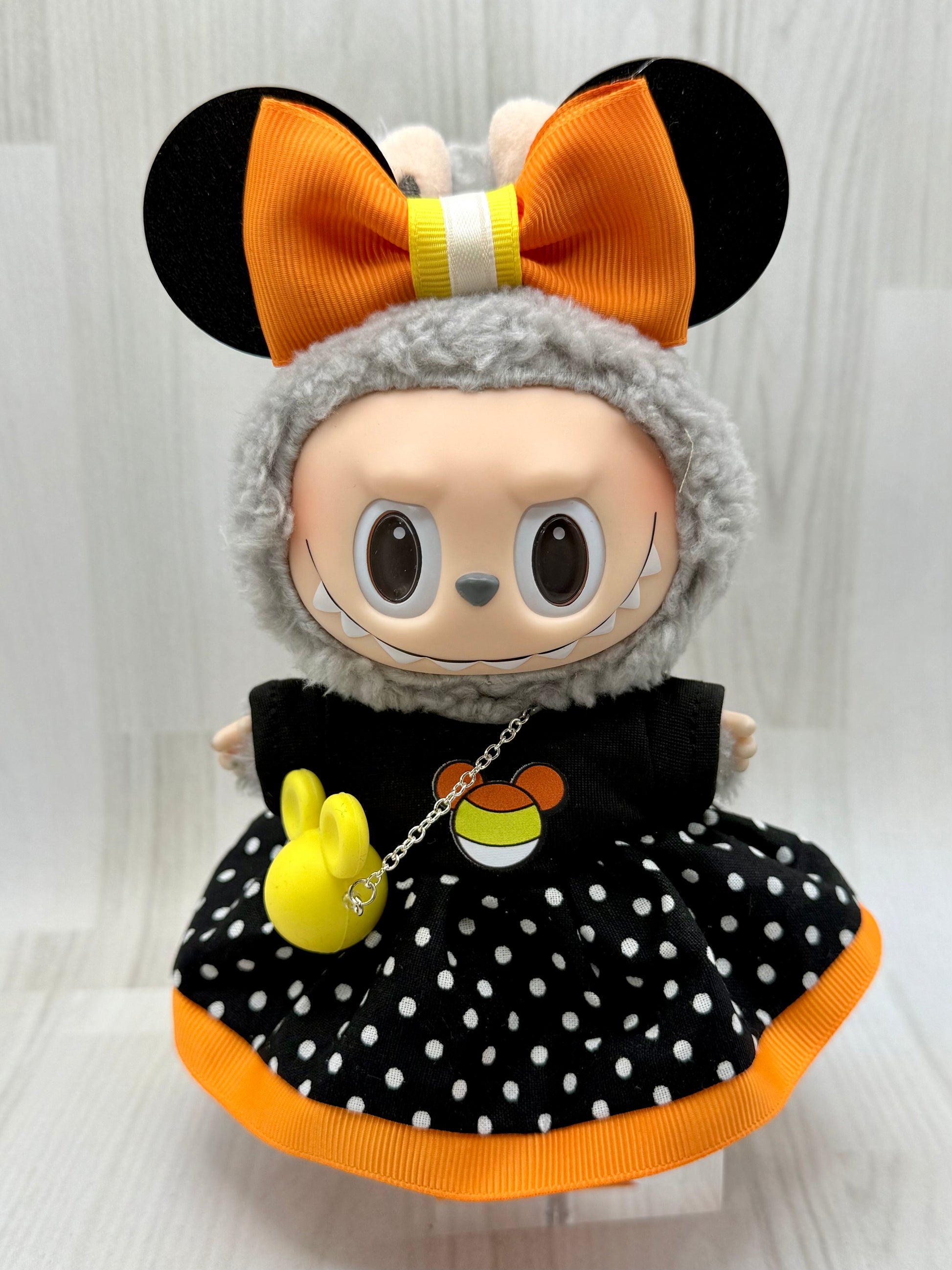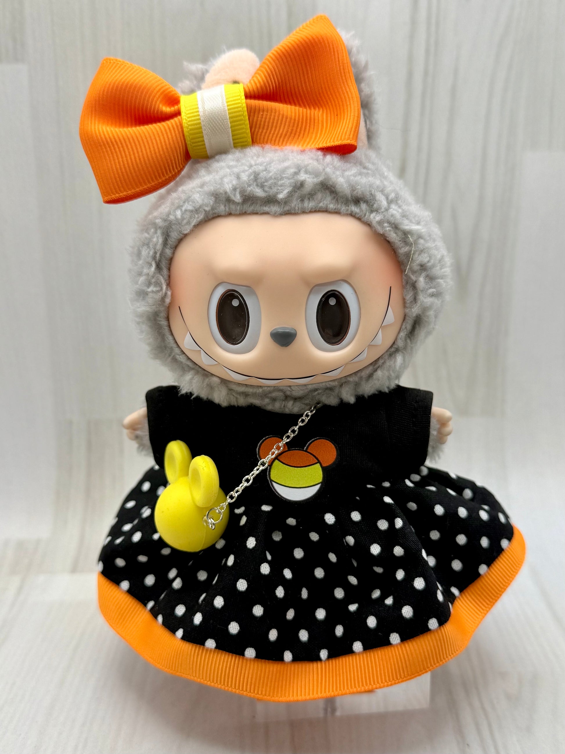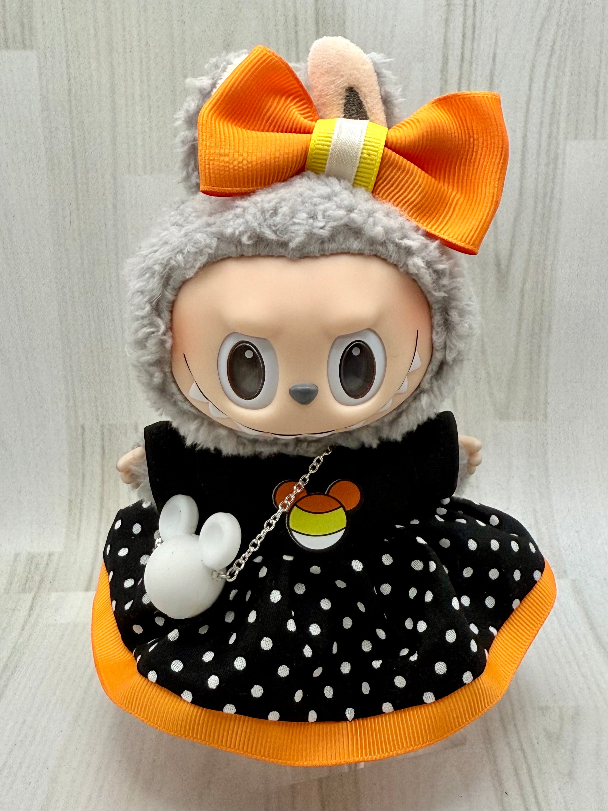Dress your plush for Halloween fun with this candy corn–inspired outfit, handmade for 6–7" dolls like Labu monster and other chibi-style figures. The set features a black polka-dot skirt with bright orange trim, a candy corn tee, and mix-and-match accessories including an oversized bow, mouse-style ears, and a candy-shaped purse in yellow or white. Lightweight, collectible, and photo-ready, these outfits are perfect for displays, trick-or-treat photos, or park-day adventures.