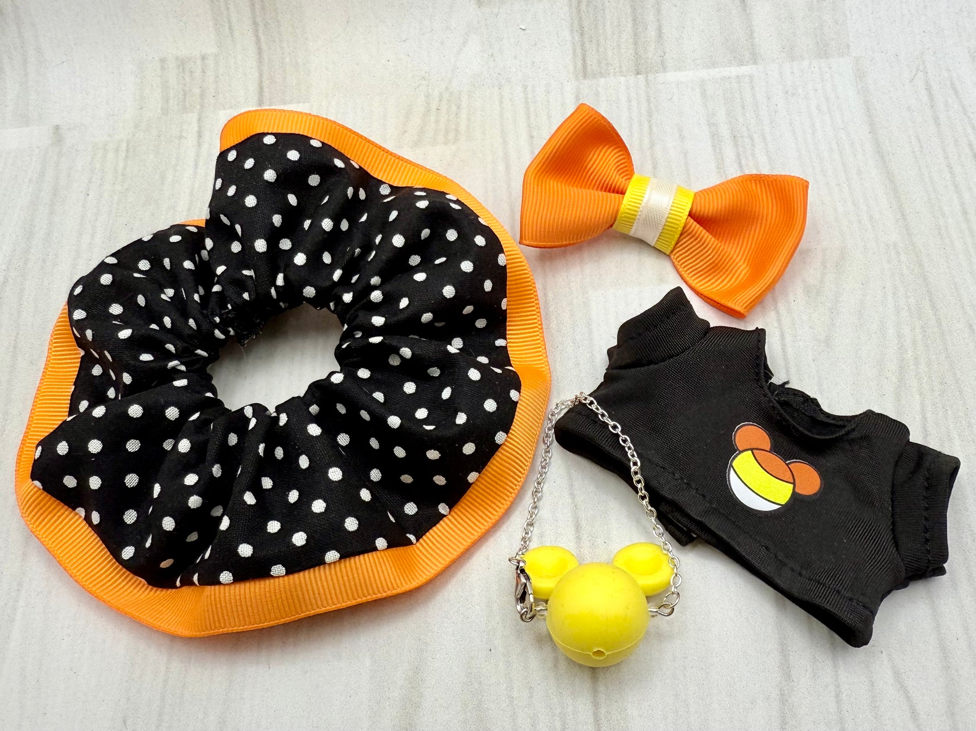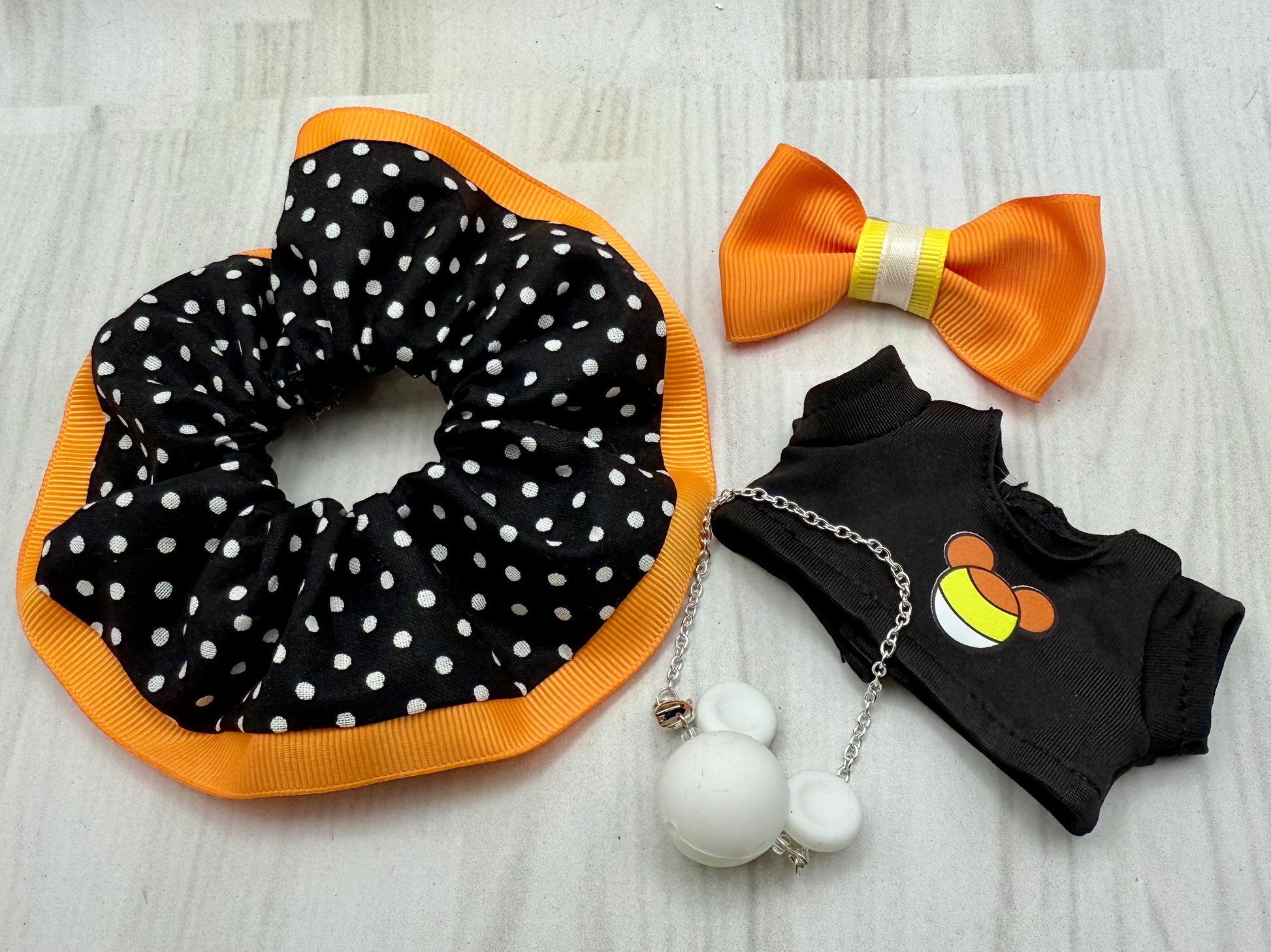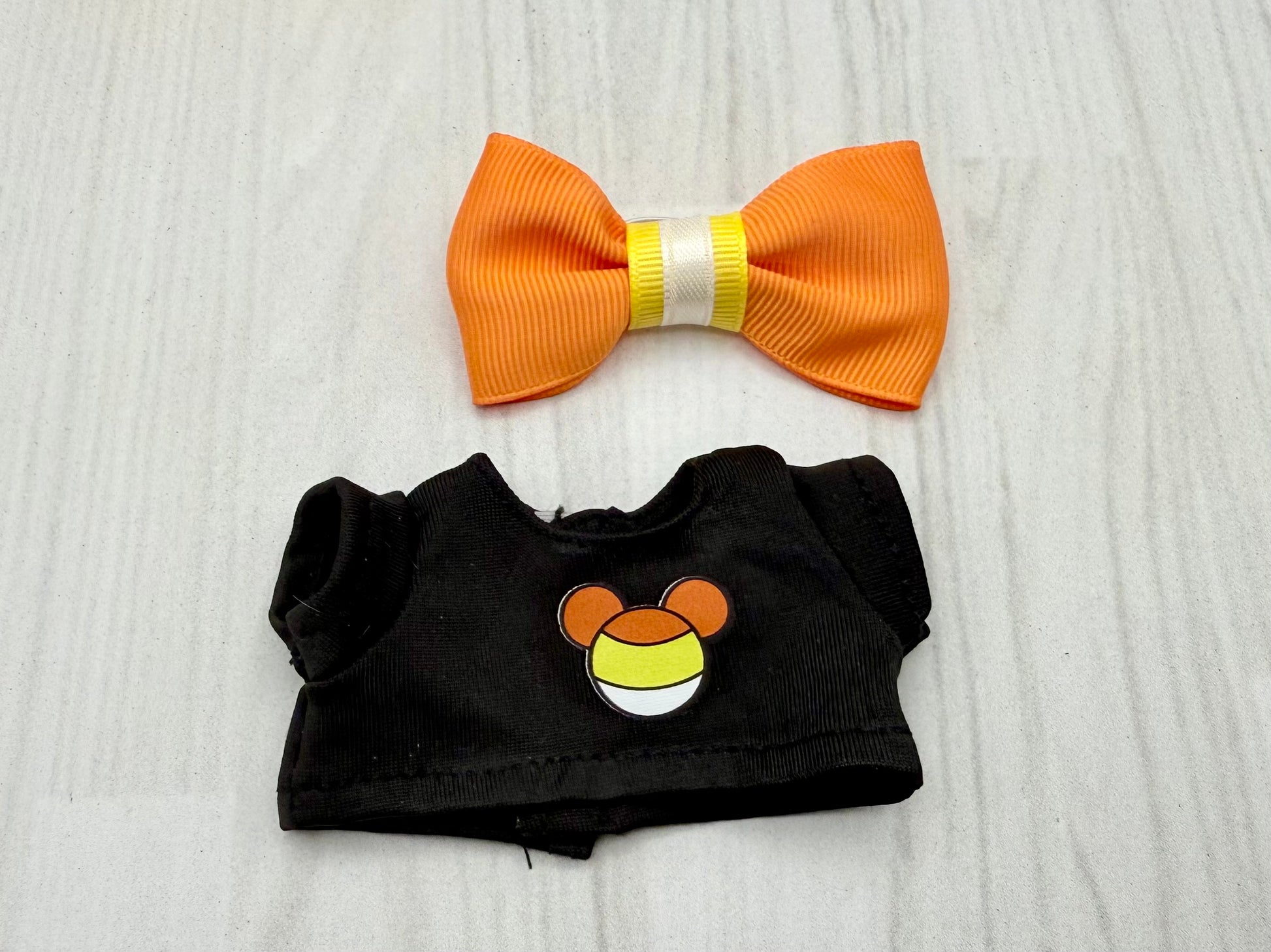 Dress your plush for Halloween fun with this candy corn–inspired outfit, handmade for 6–7" dolls like Labu monster and other chibi-style figures. The set features a black polka-dot skirt with bright orange trim, a candy corn tee, and mix-and-match accessories including an oversized bow, mouse-style ears, and a candy-shaped purse in yellow or white. Lightweight, collectible, and photo-ready, these outfits are perfect for displays, trick-or-treat photos, or park-day adventures.