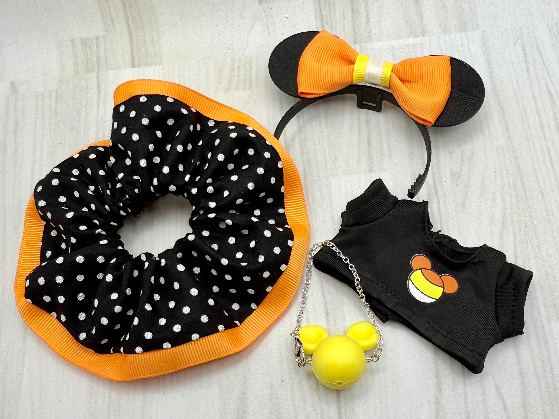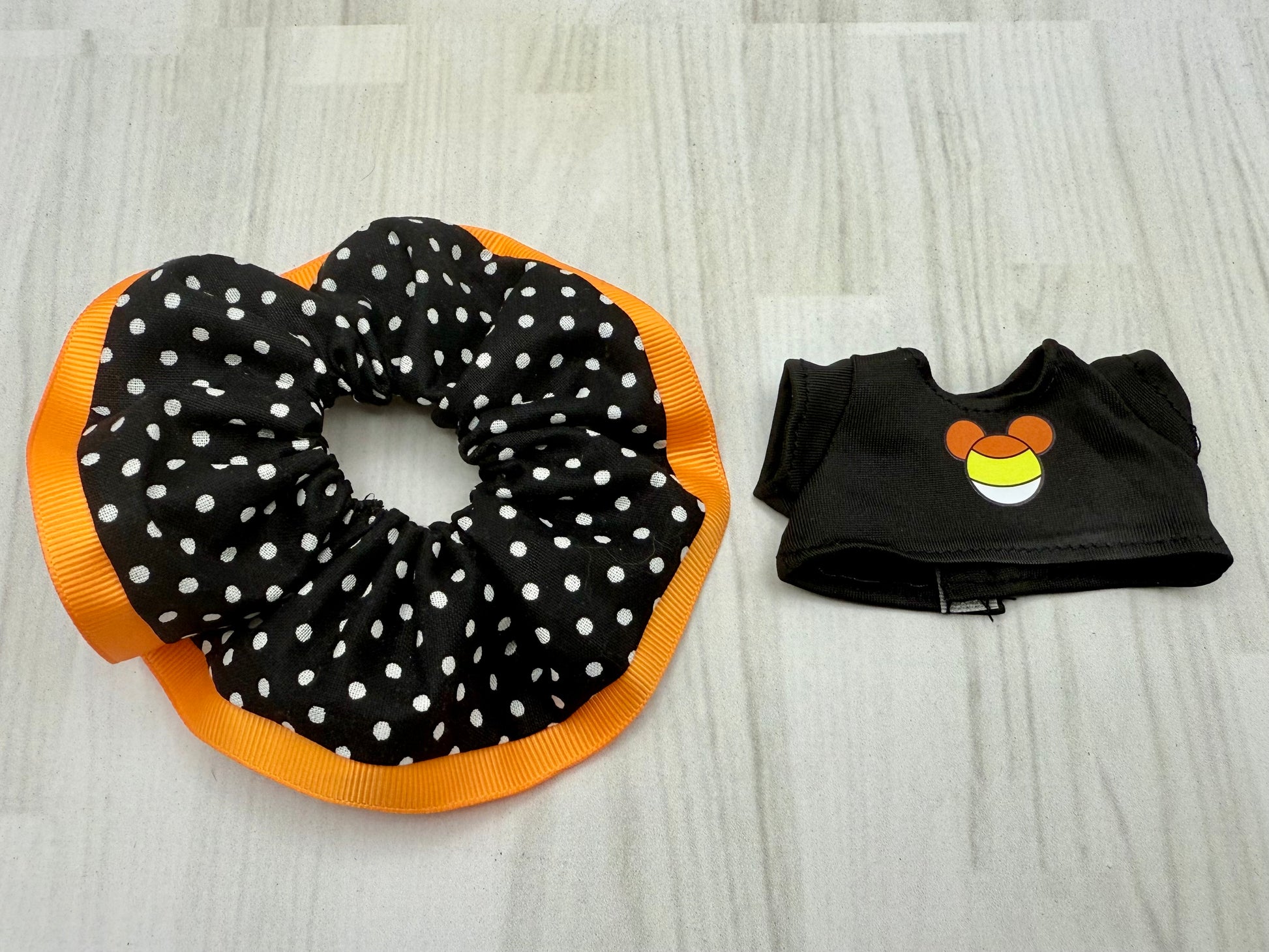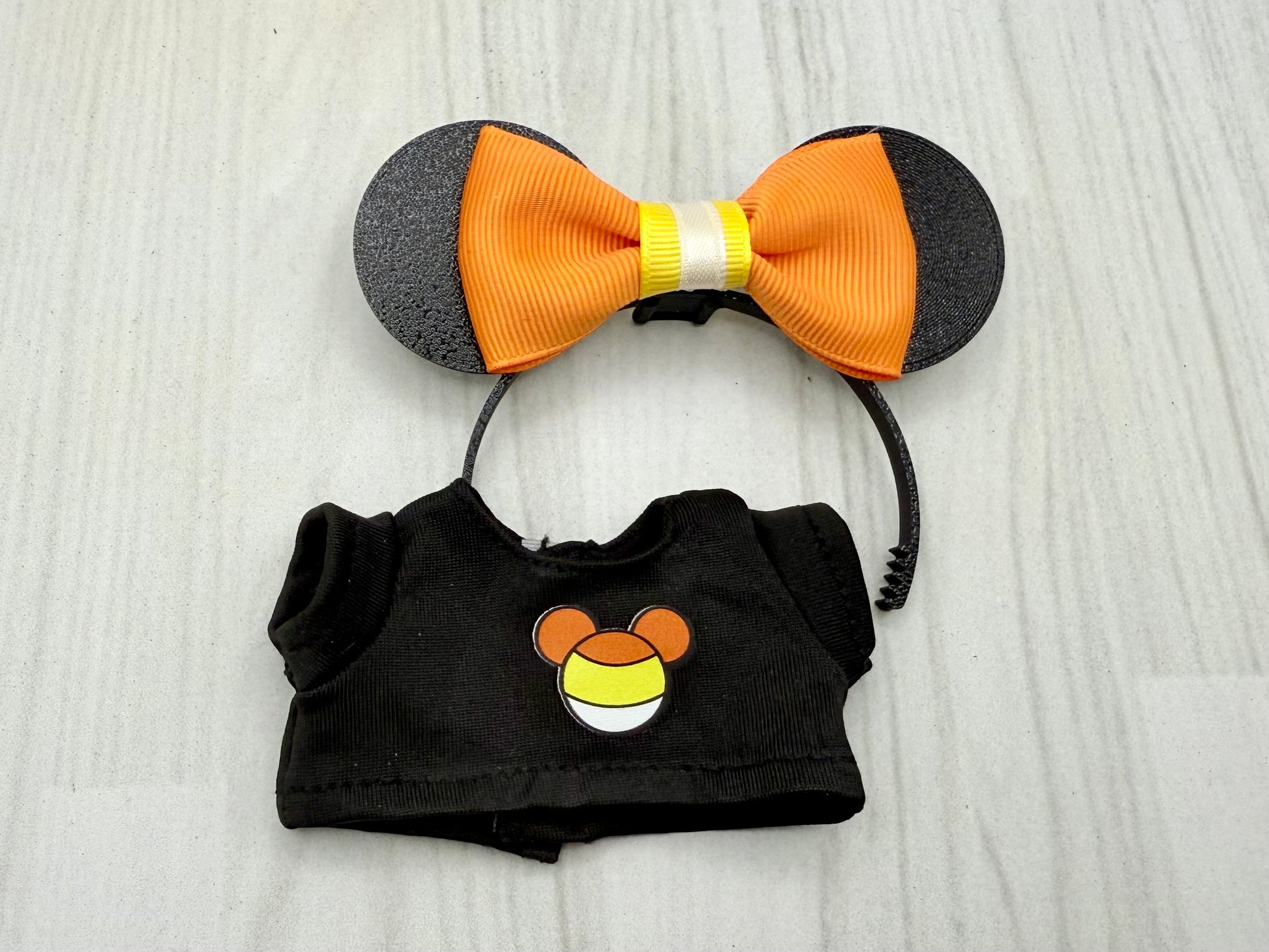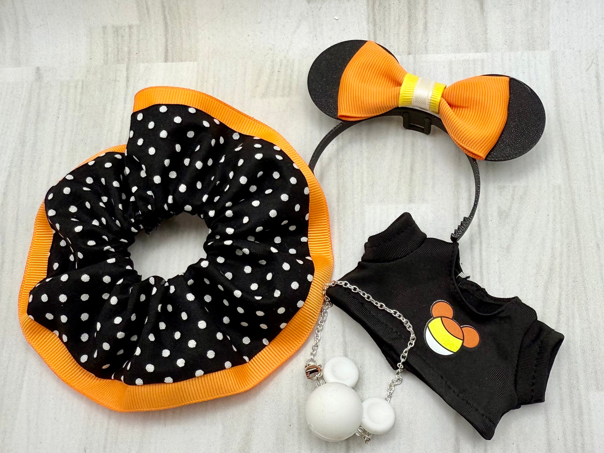 Dress your plush for Halloween fun with this candy corn–inspired outfit, handmade for 6–7" dolls like Labu monster and other chibi-style figures. The set features a black polka-dot skirt with bright orange trim, a candy corn tee, and mix-and-match accessories including an oversized bow, mouse-style ears, and a candy-shaped purse in yellow or white. Lightweight, collectible, and photo-ready, these outfits are perfect for displays, trick-or-treat photos, or park-day adventures.