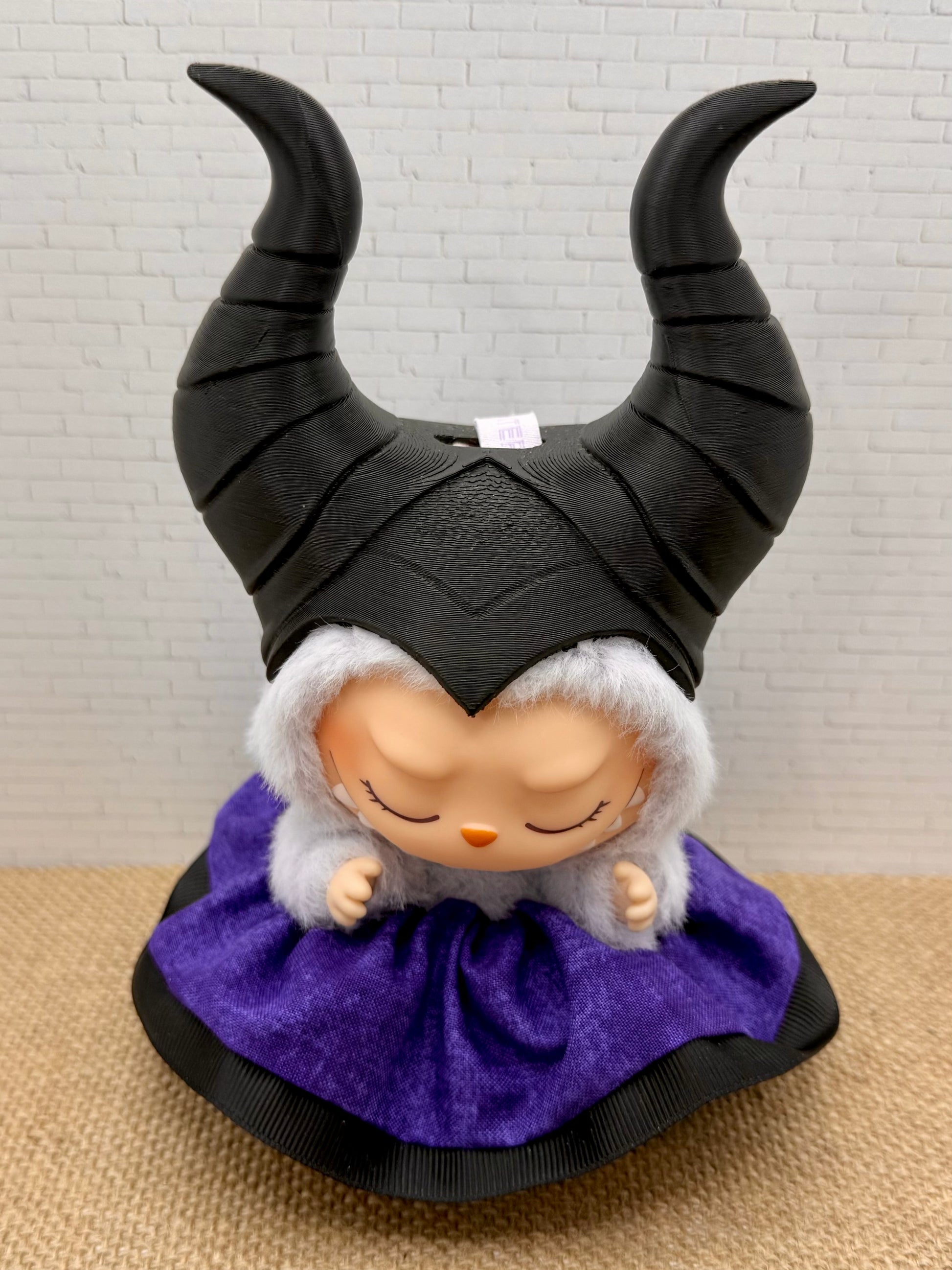 Unleash your plush’s wicked side with this dark fairy set featuring dramatic curved black horns and a flowing purple skirt trimmed in black. The 3D printed horns include a discreet back slot that slides over a standard tag loop for a secure fit, while the removable skirt makes outfit swaps easy. Designed for most 6–7 inch plush dolls and chibi figures, this lightweight set is perfect for Halloween displays, fandom shelves, or spooky photos. Doll not included.