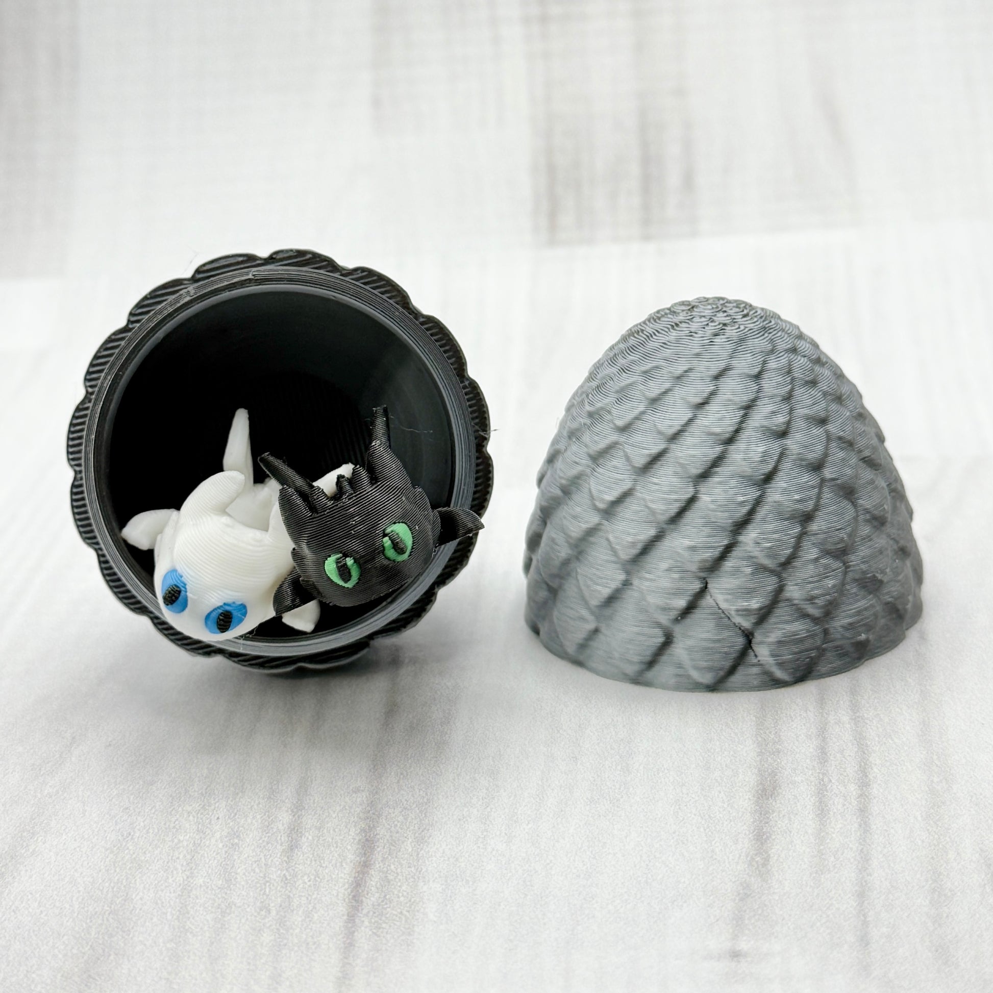 Choose your favorite — the sleek Midnight Dragon, the graceful Starlight Dragon, or bring the family together with our combo sets. Options include the Parent Duo with egg, a Hatchling Trio, or the Full Family Set with five dragons and a medium egg. Each dragon measures about 1.75" long, with egg sizes varying by set. Designed and 3D printed in-house by Everlore Creations, these dragons are durable, detailed, and made with care to ensure a magical unboxing every time.