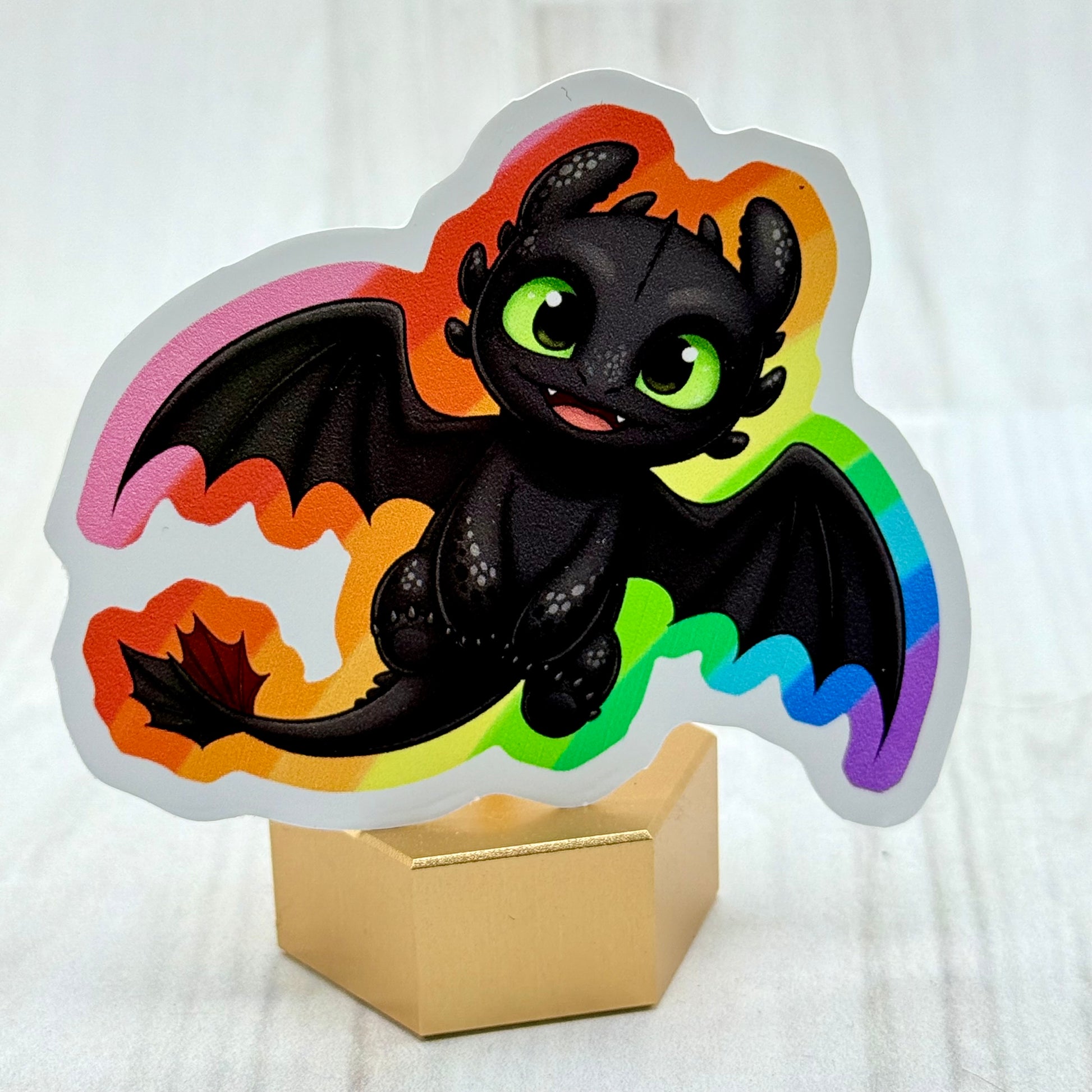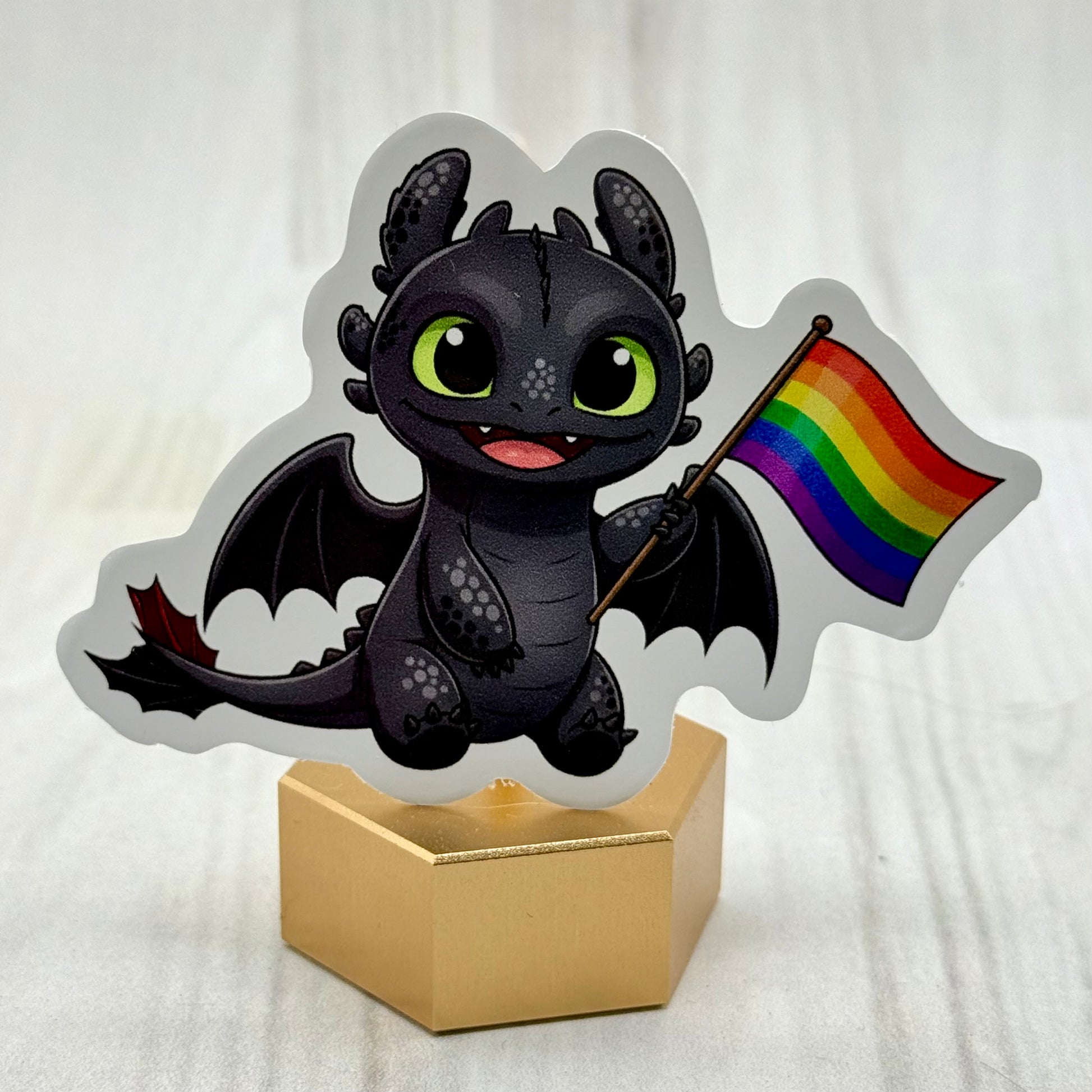 Show your colors with this bold and magical Flag Dragon sticker! Featuring a night dragon reimagined with vibrant rainbow wings and a pride flag in tow, this 3-inch vinyl sticker is perfect for laptops, water bottles, journals, or collector displays. Durable, waterproof, and weatherproof, it’s a fun way to celebrate both fandom and pride.