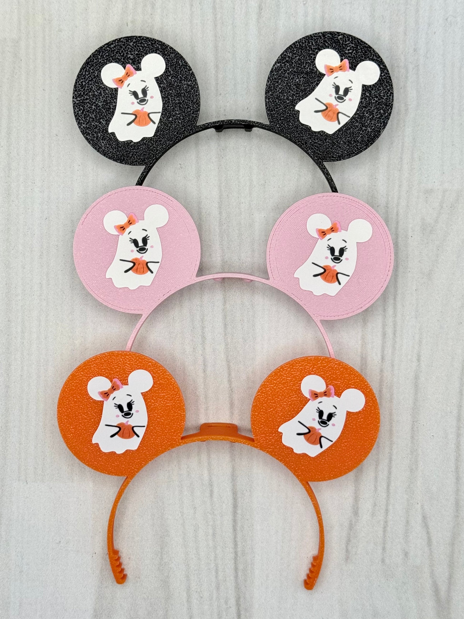 Give your plush a spooky-season upgrade with these 3D printed Boo-tiful Ghost Mouse Ears! Each headband has a slot to thread onto your plush’s ribbon tag for a secure fit, and the DTF-printed ghost designs add a crisp Halloween touch that won’t fade.