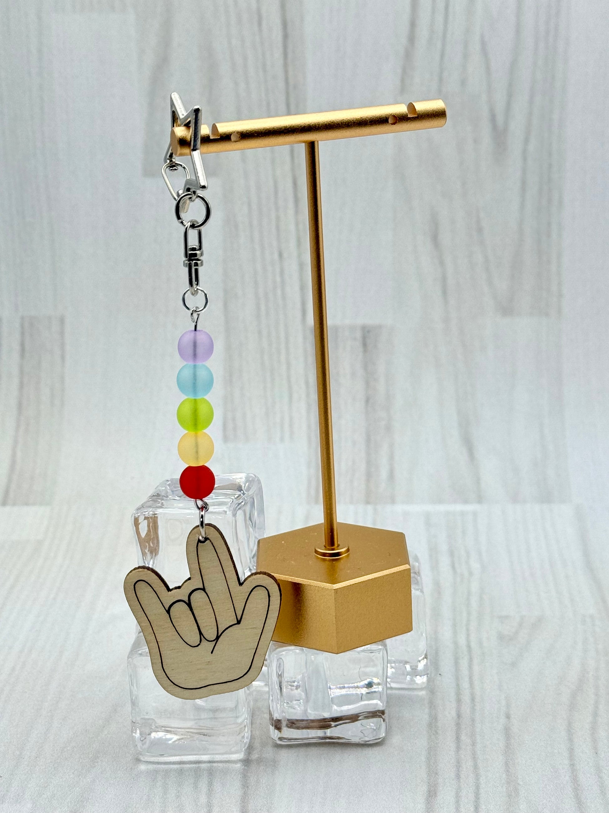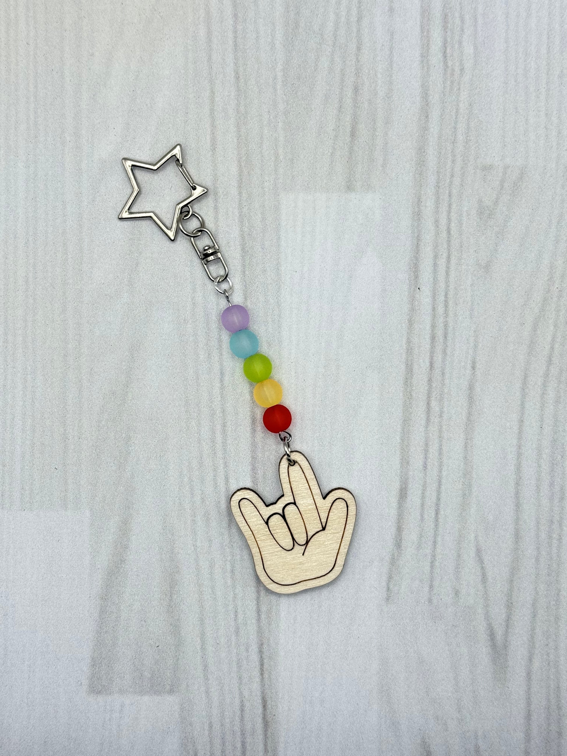 Say “I love you” in the most vibrant way possible! This handmade keychain features a laser-engraved wooden charm in the ASL “ILY” handshape, paired with frosted rainbow beads and a silver star clasp. It’s a colorful way to show Deaf pride, support ASL, or celebrate someone you love in the Deaf community.