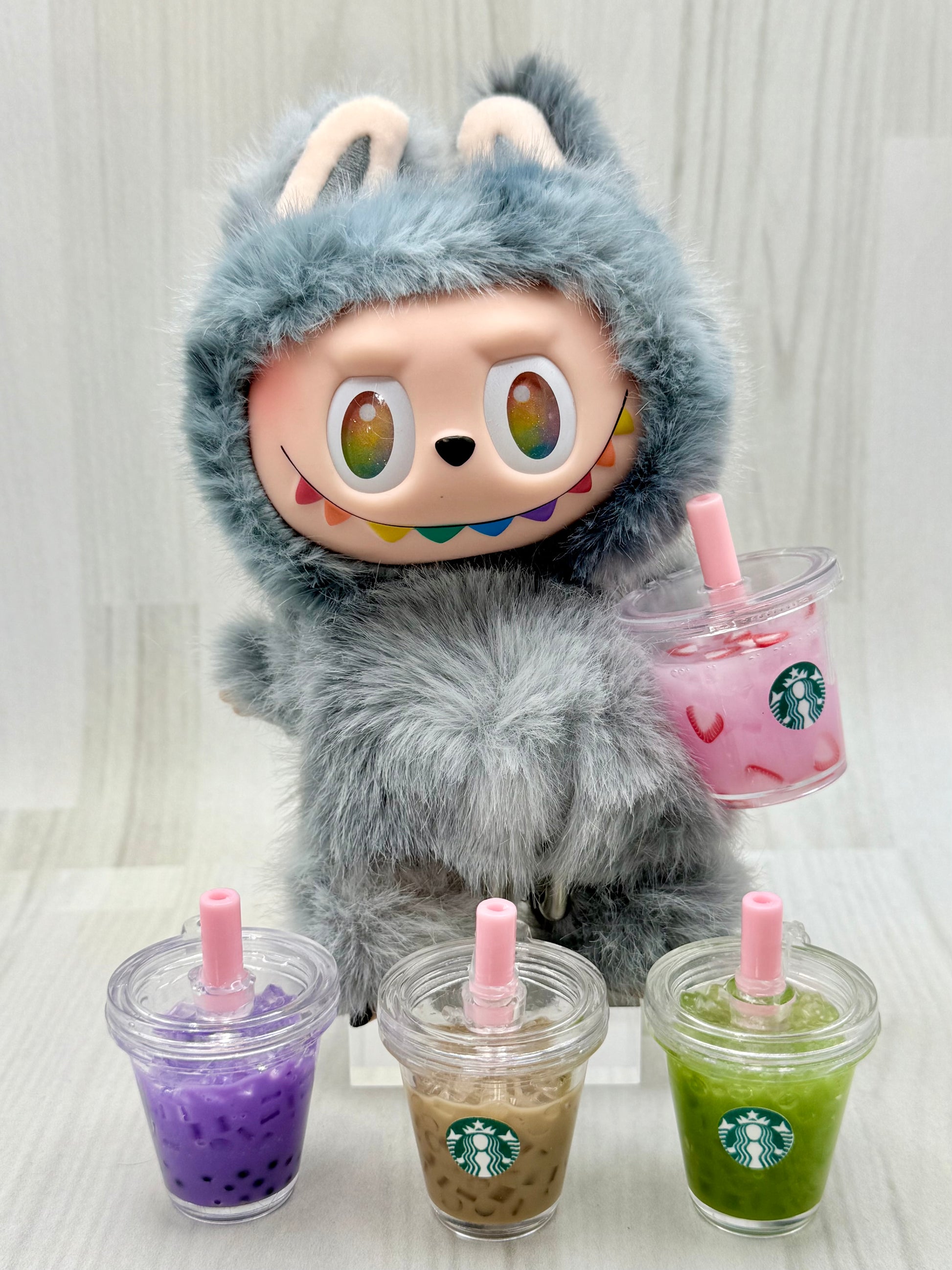 Bring coffeehouse vibes to your plush display. Handmade mini café drink props sized for 6–8 inch collectible plush figures. Choose Pink Drink, Taro, Iced Coffee, Matcha, or a Set of 4 with one of each to style photos, shelves, and toy displays. Compatible with plush lines such as Labubu or Nuimos. Doll not included.