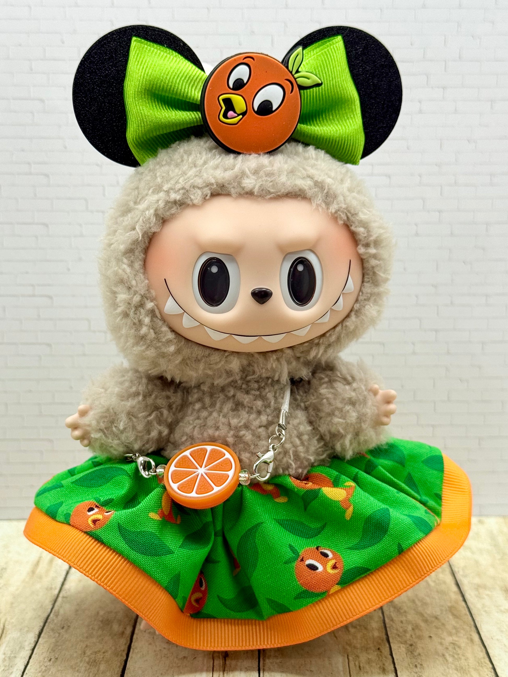 • 3D printed Mickey-style headband with green bow and a soft silicone citrus charm