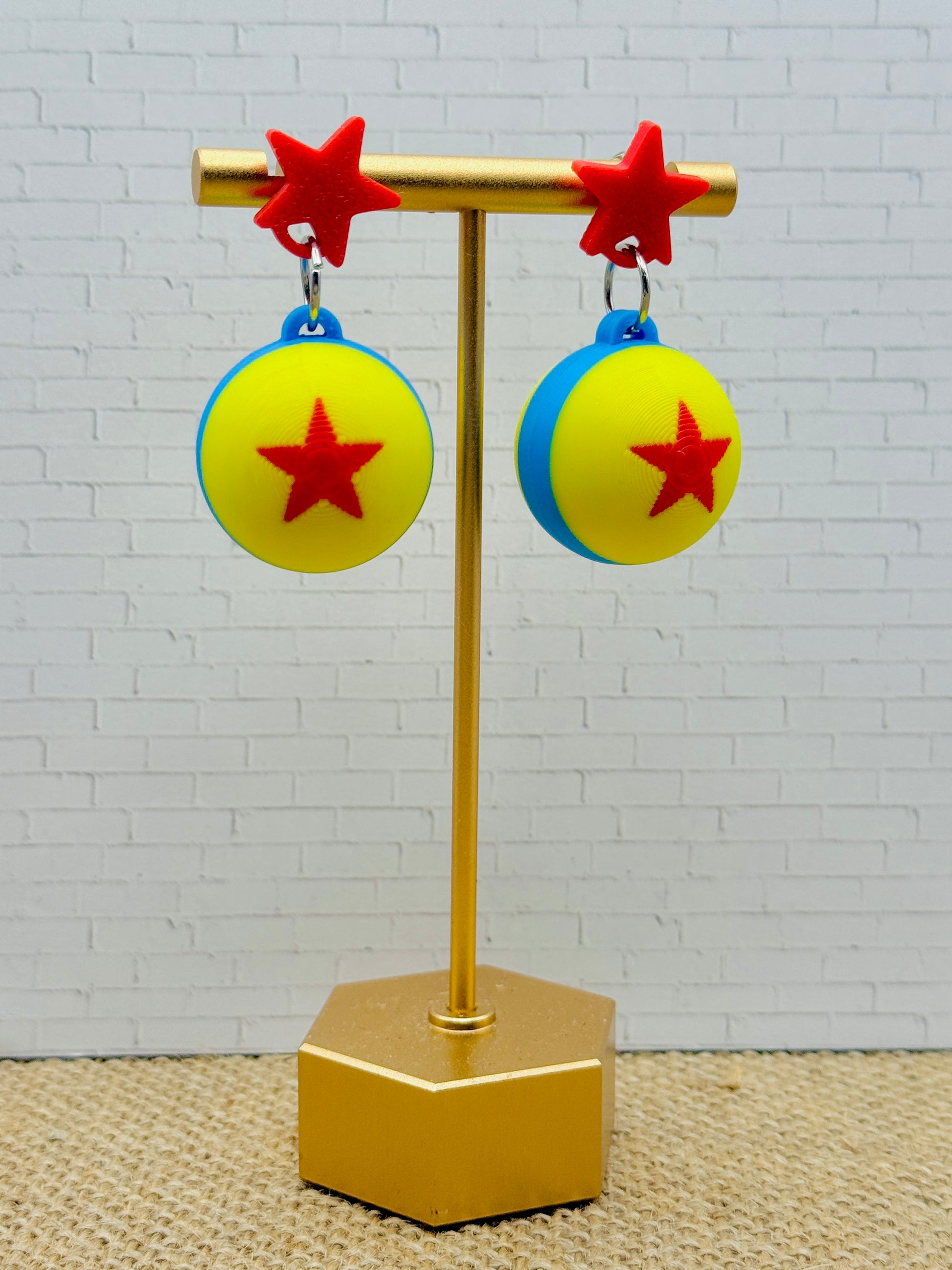 Bring a burst of nostalgic fun to your outfit with these Retro Star Toy Ball Earrings! Lightweight, bold, and theme-park perfect, each pair features a bright yellow toy-ball charm hanging from a matching red 3D printed star stud.