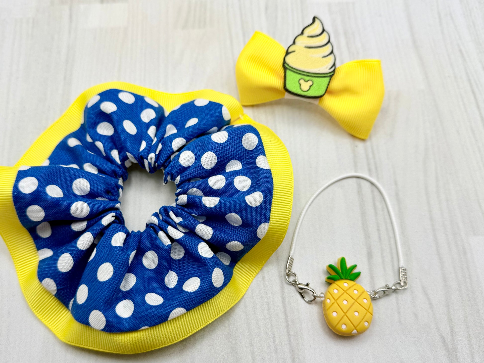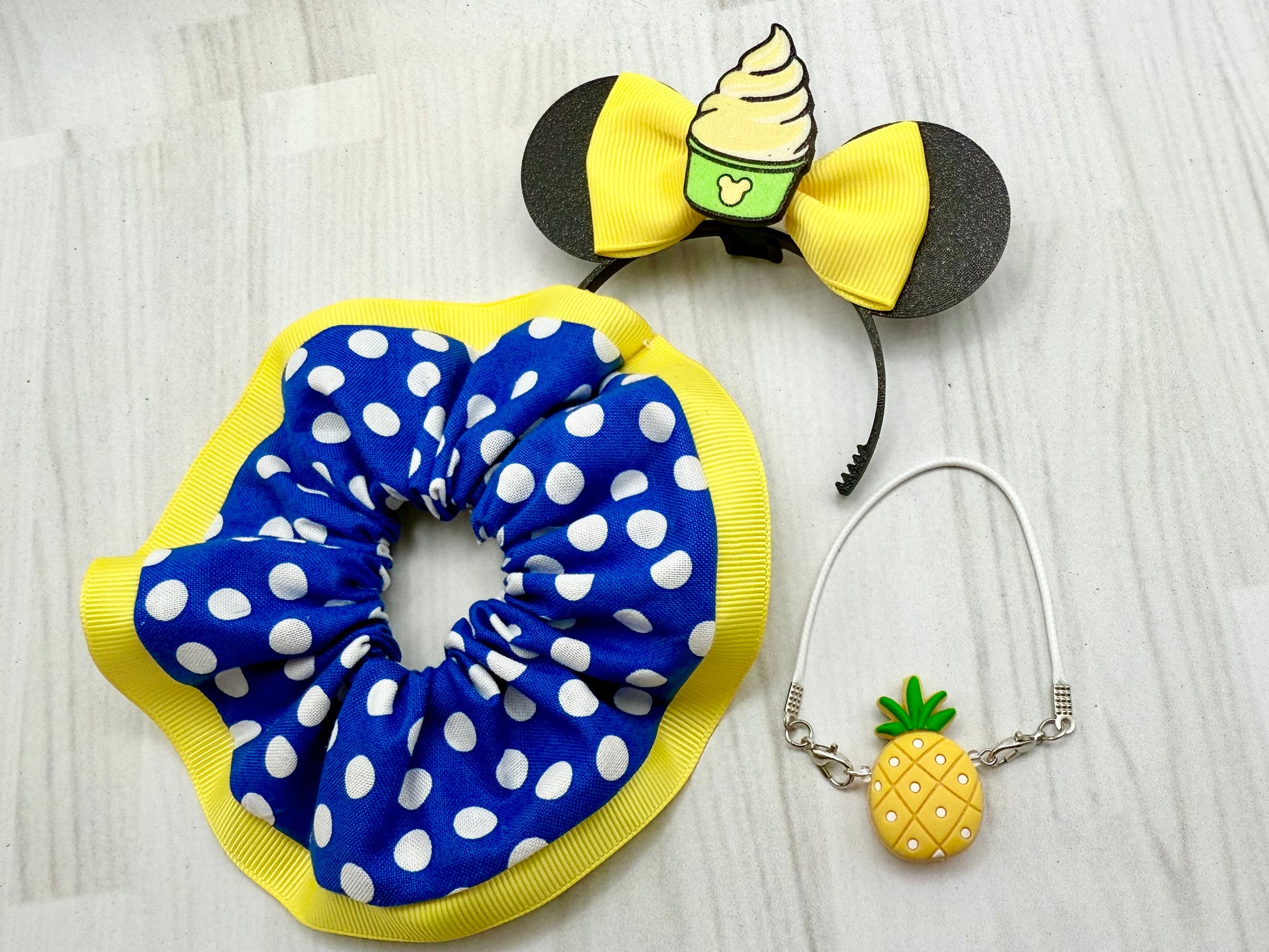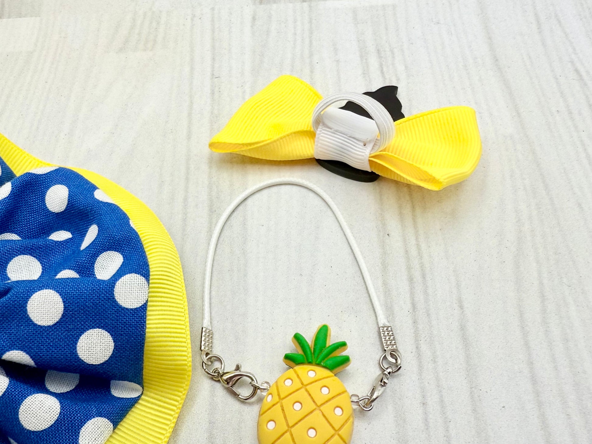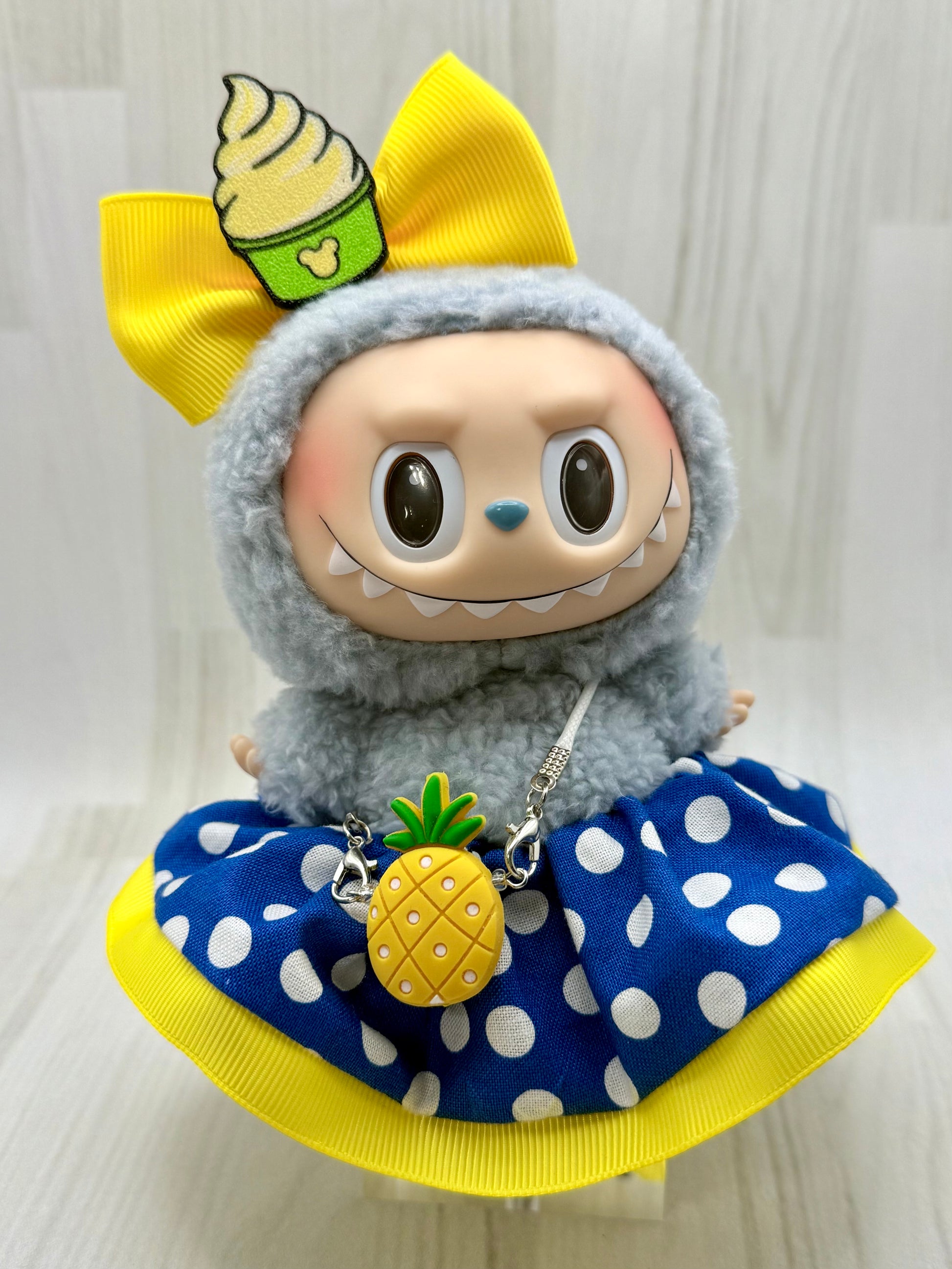 Bring tropical park-day vibes to your plush’s wardrobe with this pineapple soft-serve–inspired outfit, available in either a bow or park-style ears version. Each set includes a full yellow-and-white skirt with trim and a silicone pineapple purse with chain strap. The bow version features a yellow grosgrain bow with a soft-serve topper, while the ears version features park-style ears with a matching bow and topper. Designed to fit most 6–8" plush dolls and chibi-style figures, this outfit captures the look of the classic pineapple treat seen at theme parks. Doll not included.